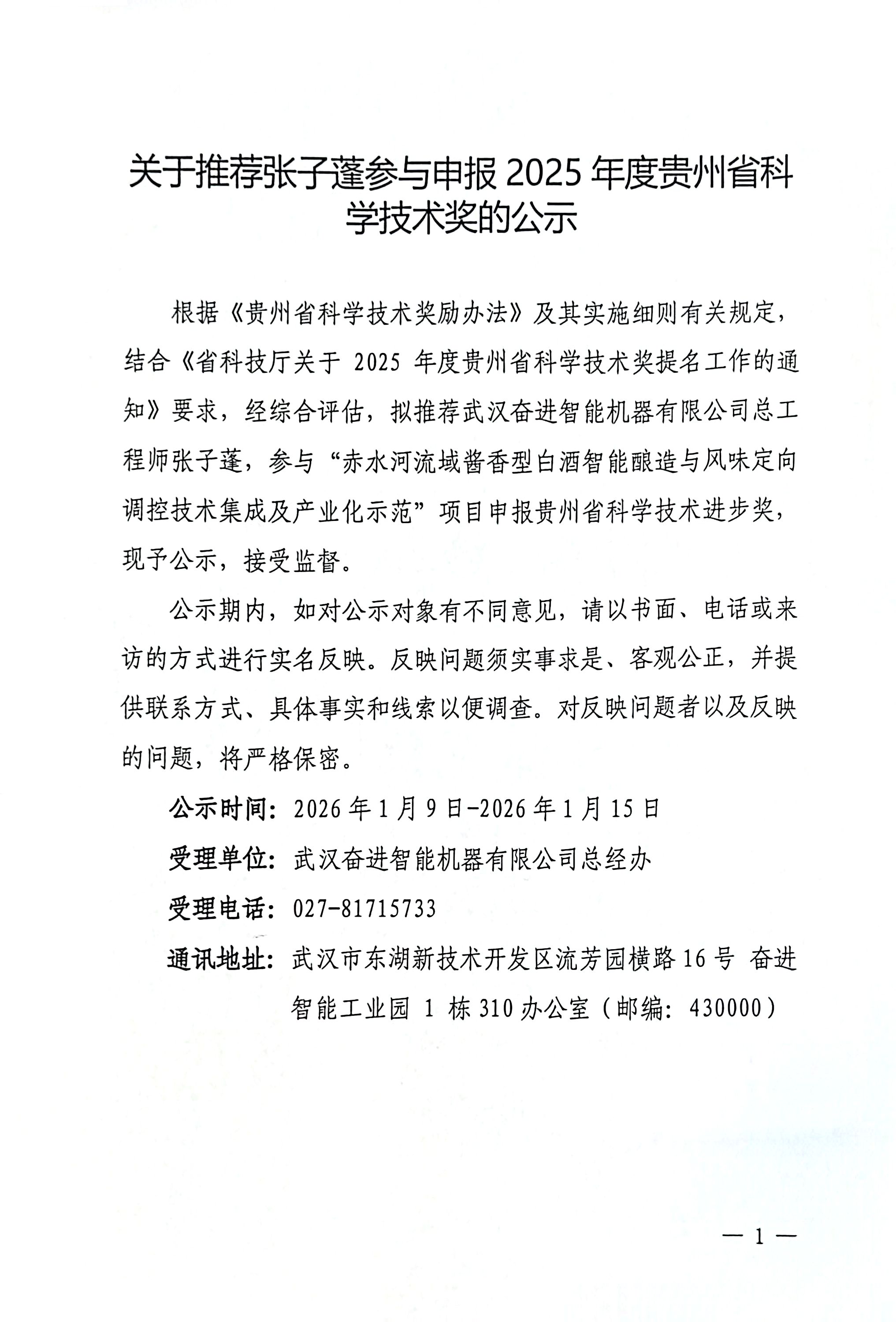 關(guān)于推薦張子蓬參與申報2025年度貴州省科學技術(shù)獎的公示